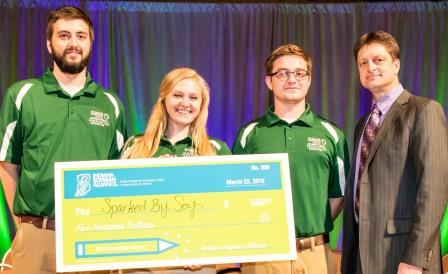 This years winner is Sparked by Soy, a soy-based fire starter. Team members are; Evan Anderson a senior in Agricultural Engineering from Churubusco, Indiana, Dylan Lowden a senior in Environmental & Health Sciences from Fort Wayne, Indiana and Sara Richert a senior in Public Relations from Oak Park. Illinois.