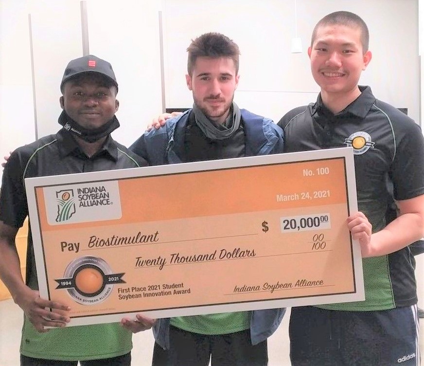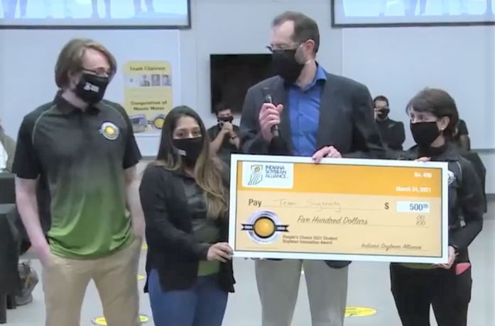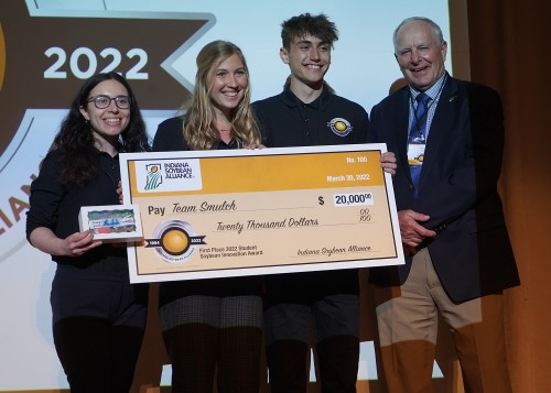 The group of four students will share a $20,000 prize for their winning entry, SoyFoliate, in the annual contest sponsored by the Indiana Soybean Alliance. The award was presented Tuesday (March 22) during a reception at the Indianapolis Roof Ballroom.