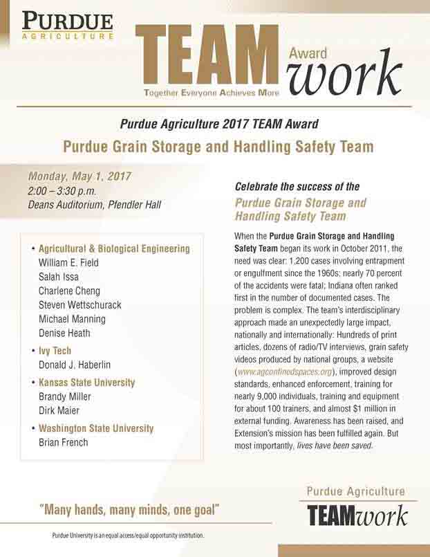 The Purdue Grain Storage and Handling Safety Team will receive the Purdue Agriculture Teamwork Award (Together Everyone Achieves More). A reception will follow in Leopold's Landing.
