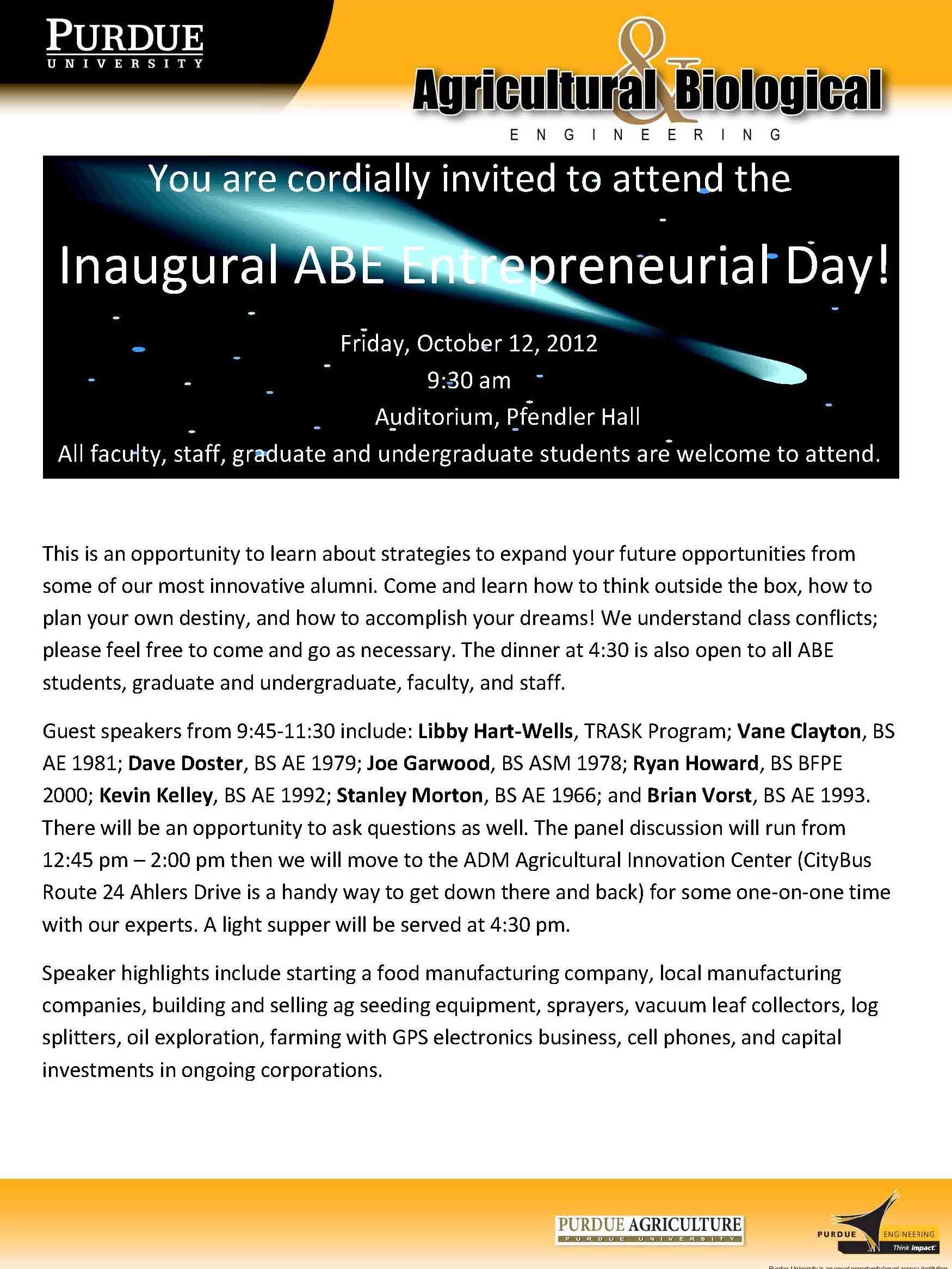 The ABE Department will be holding a new event this fall: The ABE Entrepreneurial Day. On Friday, October 12, 2012, 7 alumni will be returning to campus to share their adventures as entrepreneurs and to share some of the mindset required to be your own boss.