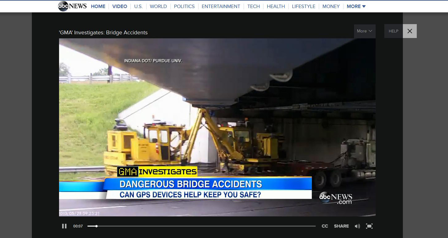 After initial testing, INDOT requested the Virginia Avenue Bridge, located in Indianapolis over the I-65/I/70 split, be outfitted with the test equipment due to recent significant bridge strikes. The temporary equipment provided real-time high definition video footage to key personnel via email moments after a strike occurred. The footage culminated into a short video that was used for a media campaign to prepare drivers and residents for temporary road closure of the interstate. The campaign grabbed national attention through INDOT's efforts with stories covered on MSNBC, the Today Show, and Good Morning America. Over a year later, the video is still resurfacing once again on Good Morning America. Link to Story
