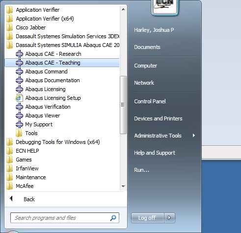 Most people will start Abaqus using the menu above, but if you want to start Abaqus from the command line/command prompt/cmd window, a Research license will be used by default. If you need to use a teaching license, follow these steps: