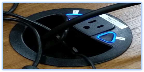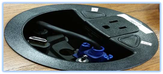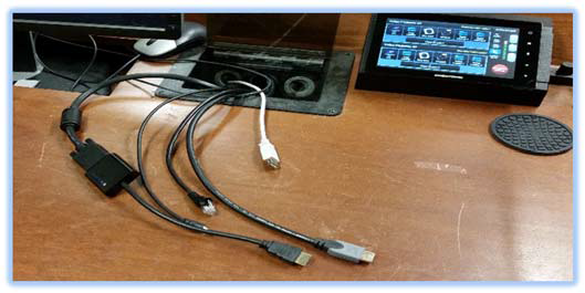 This displays a laptop using the cables at the podium