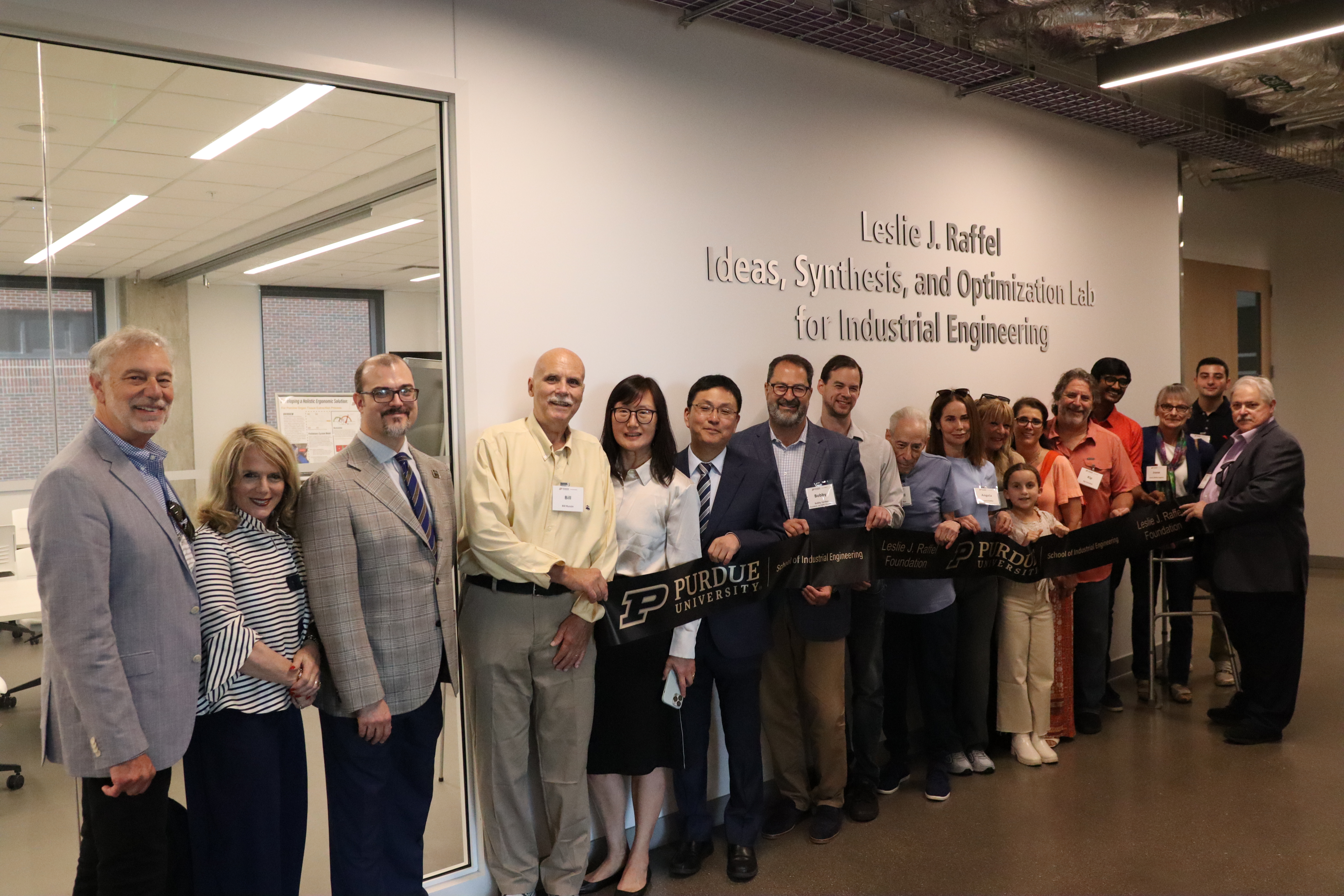 Leslie J. Raffel Foundation Members, along with Young-Jun Son, James J. Solberg Department Head and Ransburg Professor of Industrial Engineering and Assistant Head Pat Brunese, pose for a photo at the dedication of the new lab space.