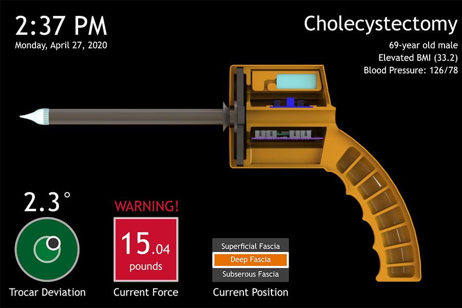 1st Place (tie): Smart Tool for First Access in Laparoscopic Procedures (Team First Access): Brian Acosta, Justin Brolley, Chiranth Kishore, Naveed Riaziat, Marc Turenne. There are one million laparoscopic procedures each year in the United States, and 5% result in first access complications. The intent of our project was to deliver a developmental smart tool to Intuitive. This device will be further optimized to assist surgeons in gaining first access to the abdominal cavity and reduce the risk of injury to patients during laparoscopic surgery. Our vision was to surpass customers’ functionality, usability, and safety requirements through a sustainable and reusable surgical tool that establishes industry leadership in innovative first entry technology. The future state of our project is to use smart mechanisms to reduce surgeon fatigue, improve patient outcomes, and increase minimally-invasive surgery adoption by providing an intuitive, cost-competitive medical device to be used in all laparoscopic procedures. Our virtual prototype will highlight key mechanical and electrical components, with a supplemental guide-for-assembly and formal test plan.