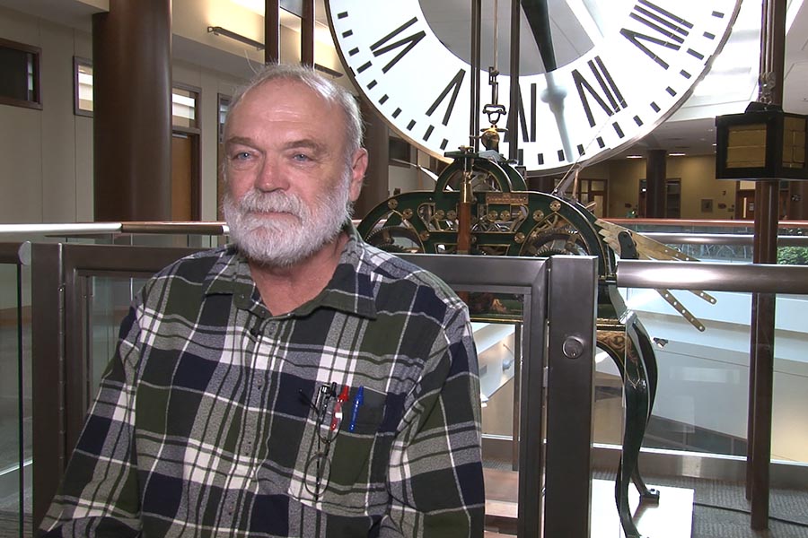 He also brought a unique and creative viewpoint to mechanical engineering. He played bassoon in local orchestras, and collected antique mechanical clocks. This came in handy in 2011, when Purdue was constructing an addition to the Mechanical Engineering building, and wanted a mechanical object as its centerpiece. He collaborated with Mike Sherwood and Jack Fessler to restore the original Heavilon Hall clock, which was created in 1895, and had been sitting in pieces since 1956. They restored the mechanical clock to full functionality, including a 12-foot pendulum. For the next decade, he also faithfully wound the clock: cranking a 200-pound counterweight every four days, and adjusting the clock hands to compensate for humidity or other changes.