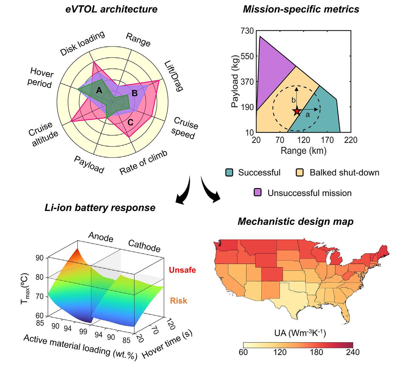 With this in mind, the team analyzed the electrochemical performance through the five phases of a typical eVTOL journey: liftoff, climbing, cruising, descending, and landing. But they also determined there is a sixth phase, the “balked” phase, which requires critical attention.