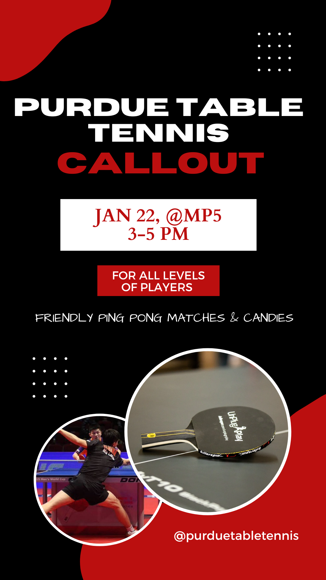 CALLOUT: Join the Purdue Table Tennis Club this weekend! Callout is Sunday, January 22, from 3:00-5:00 pm in Multipurpose Room 5 of the Co-Rec. Men and women of all skill levels are welcome, for friendly play and competitive matches. Follow us on Instagram: @purduetabletennis