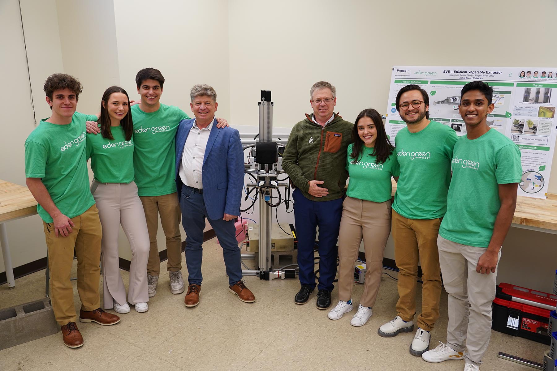 1st place (tie): Eden Green, Sofía Delfini, John Dumbleton, Michael Goldberg, Praneel Jasinghe, Elena Krizman, Juan Pablo Olloqui. Eden Green Technology is an innovative agricultural startup focused on the vertical hydroponic industry with the goal of providing high quality, locally grown produce that is cost effective for the consumer. Currently, human-operated forklifts navigate the plant columns for harvesting, but this is dangerous, tedious, and inefficient. EVE is a cutting-edge autonomous robot capable of reliably locating, harvesting, and depositing plants into a collection bin, and is the perfect solution to this problem. The design combines a 3D computer vision system for precise plant location, a dynamic 2-axis positioning mechanism, a pneumatic cutting mechanism for clean stem cuts, and a gripping mechanism for handling both leaves and the transfer of harvested plants into the collection bin. The robot has been designed for both speed and reliability with Eden Green’s unique greenhouses in mind for seamless integration. This innovation will transform Eden Green’s hydroponic practices, fostering a sustainable, automated future.