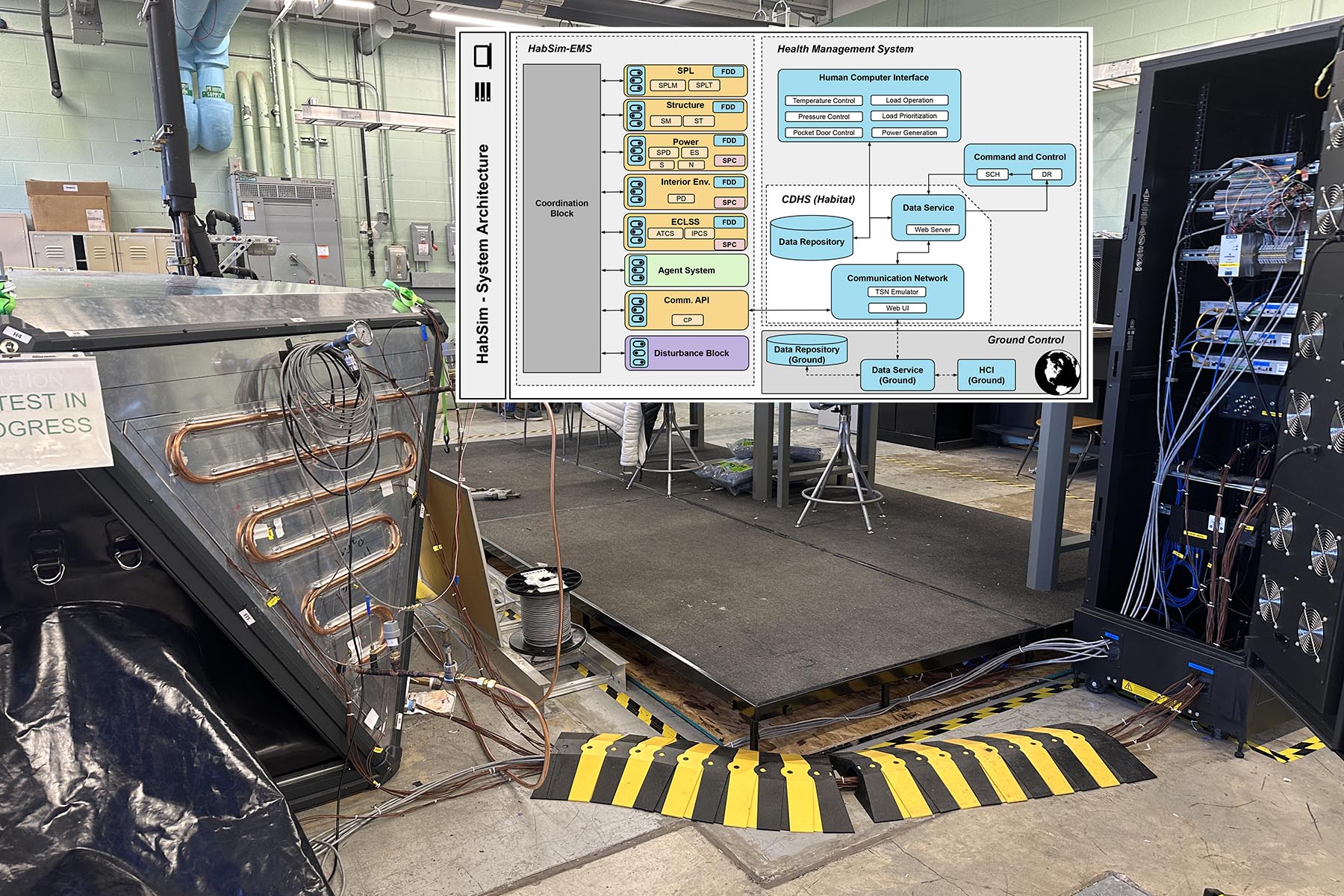 HabSim is part of the SmartHab cyber-physical testbed, located at Purdue’s Herrick Labs. The testbed is comprised of certain selected physical components, coupled with a number of cyber components, or numerical models. Researchers run tests involving the coupled system, and data collected from the testbed allows them to better understand autonomy and resilience, as well as establish guidelines for the design and operation of future space habitats, furthering the goals of RETHi.