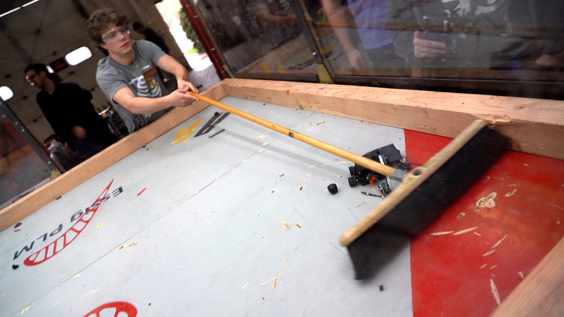 After a few chaotic minutes, one bot usually gives up the ghost, and the match is over. Students “safe” the weapons on their bot before retrieving them. Volunteers then use brooms to clean up the playfield — sweeping up a hilarious mix of 3D-printed plastic bits, electronics, and chunks of the plywood playfield chipped away by overly zealous attacks.