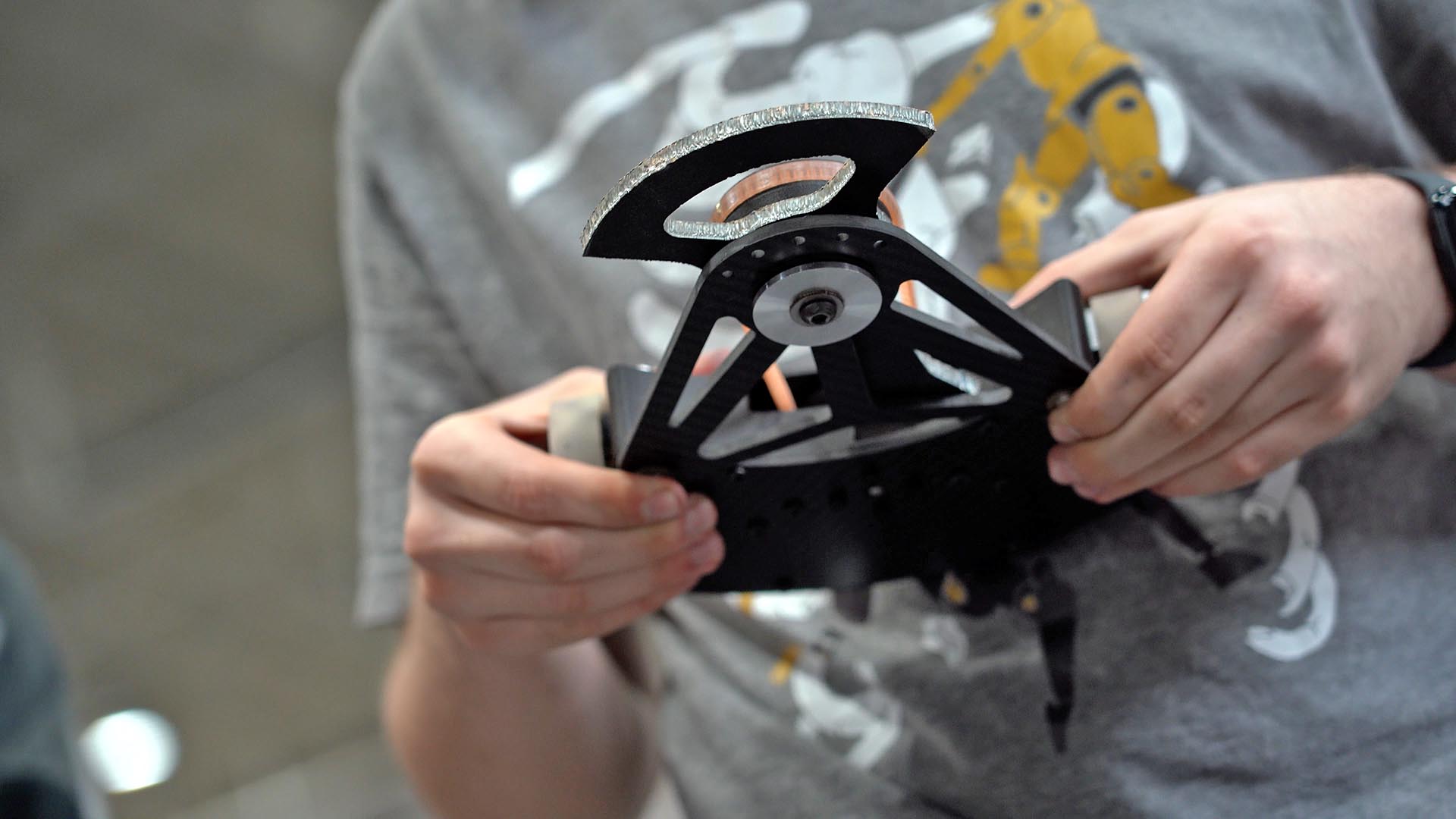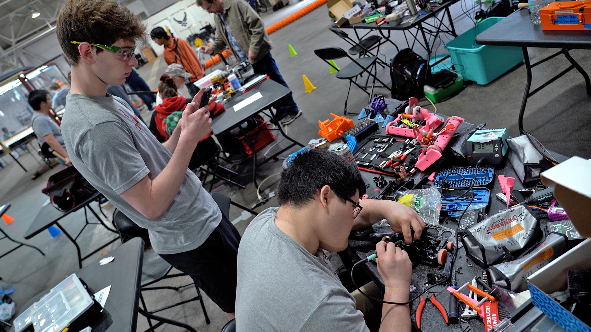 At the repair tables, there is just as much activity as on the playfield. Students are soldering loose wires, sharpening blades, swapping out parts or 3D-printing new ones. “The best thing you can do is to have a robot that’s configurable,” Frazee said. “Swap out different kinds of weapons, or lifting forks, or arms. Even modular armor — depending in your opponent, you may need more protection on the front, the sides, or the top.”