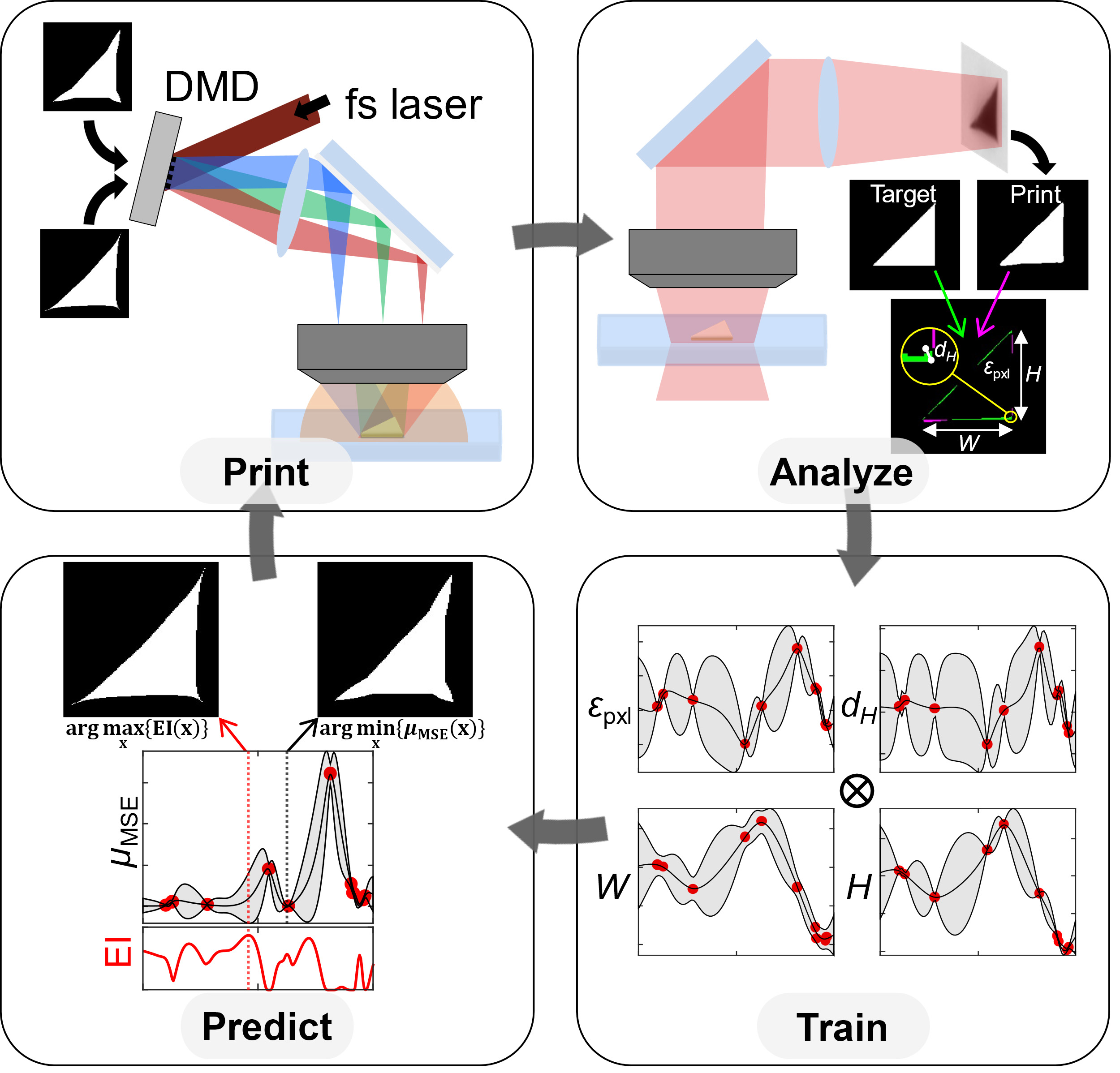 In a new paper published in Light Science & Application, Xu's team describes an active machine learning-based framework to determine the optimal parameters for the rapid, projection micro- and nano- scale printing process. They developed an active learning framework using Bayesian optimization to inform optimal experimentation in order to adaptively collect the most informative data for effective training of a Gaussian-process-regression-based machine learning model. This model then serves as a surrogate for the manufacturing process: predicting optimal process parameters for achieving a target geometry.