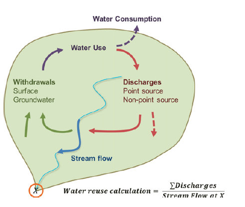 “Increasing demands for freshwater make it necessary to find innovative ways to extend the life of our water resources, and to manage them in a sustainable way. Indirect water reuse plays a role in meeting freshwater demands but there is limited documentation of it. There is a need to analyze its current status for water resources planning and conservation, and for understanding how it potentially impacts human health. However, the fact that data are archived in discrete uncoordinated databases by different state and federal entities, limits the capacity to complete holistic analysis of critical resources at large watershed scales. Humans alter the water cycle for food production, manufacturing, energy production, provision of potable water and recreation. Ecosystems services are affected at watershed scales but there are also global scale impacts from greenhouse gas emissions enabled by access to cooling, processing and irrigation water. To better document these issues and to demonstrate the utility of such an analysis, we studied the Wabash River Watershed located in the U.S. Midwest. Data for water extraction, use, discharge, and river flow were collected, curated and reorganized in order to characterize the water use and reuse within the basin. Indirect water reuse was estimated by comparing treated wastewater discharges with stream flows at selected points within the watershed. Results show that during the low flow months of July–October, wastewater discharges into the Wabash River basin contributed 82 to 121% of the stream flow, demonstrating that the level of water use and unplanned reuse is significant. These results suggest that intentional water reuse for consumptive purposes such as landscape or agricultural irrigation could have substantial ecological impacts by diminishing stream flow during vulnerable low flow periods.”